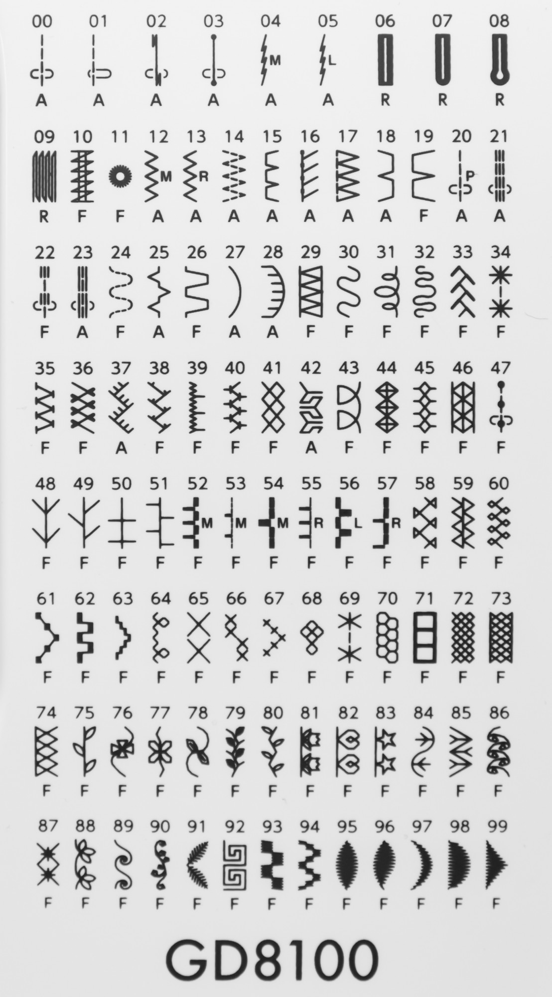 The Janome GD8100 offers 100 stitches, 3 automatic one step buttonholes, speed control, needle up/down, needle threader, start / stop button for opperation without the foot control, soft dust cover. The Janome GD8100 also features the proven top loading magnetic rotary hook and come with a 2 year warrany..