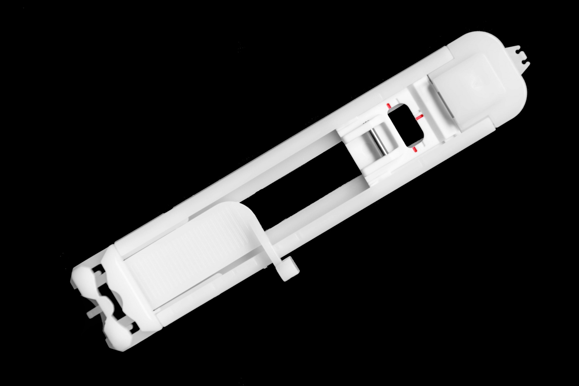 Sliding snap-on buttonhole foot with markings for acurate sizing of buttonholes. For standard front load 5mm swing sewing machines.