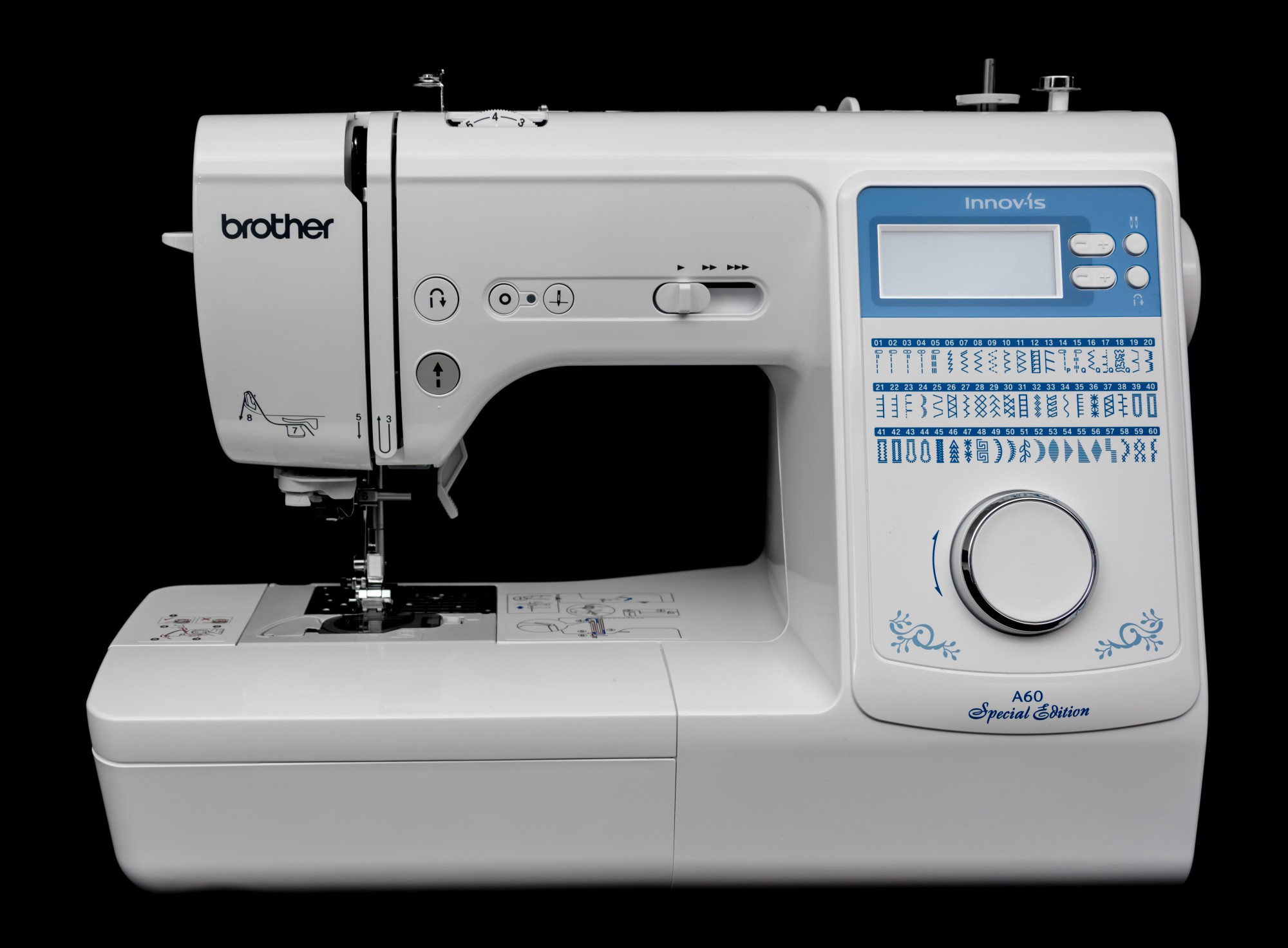 Brother Innov-is A60 is a mid range computerised machine. The Innovis A60 has 60 stitches selected using a "Jog Dial", 6 buttonholes, needle threader, quick set top load bobbin, back-lit LCD display, drop feed, 2 year warranty.